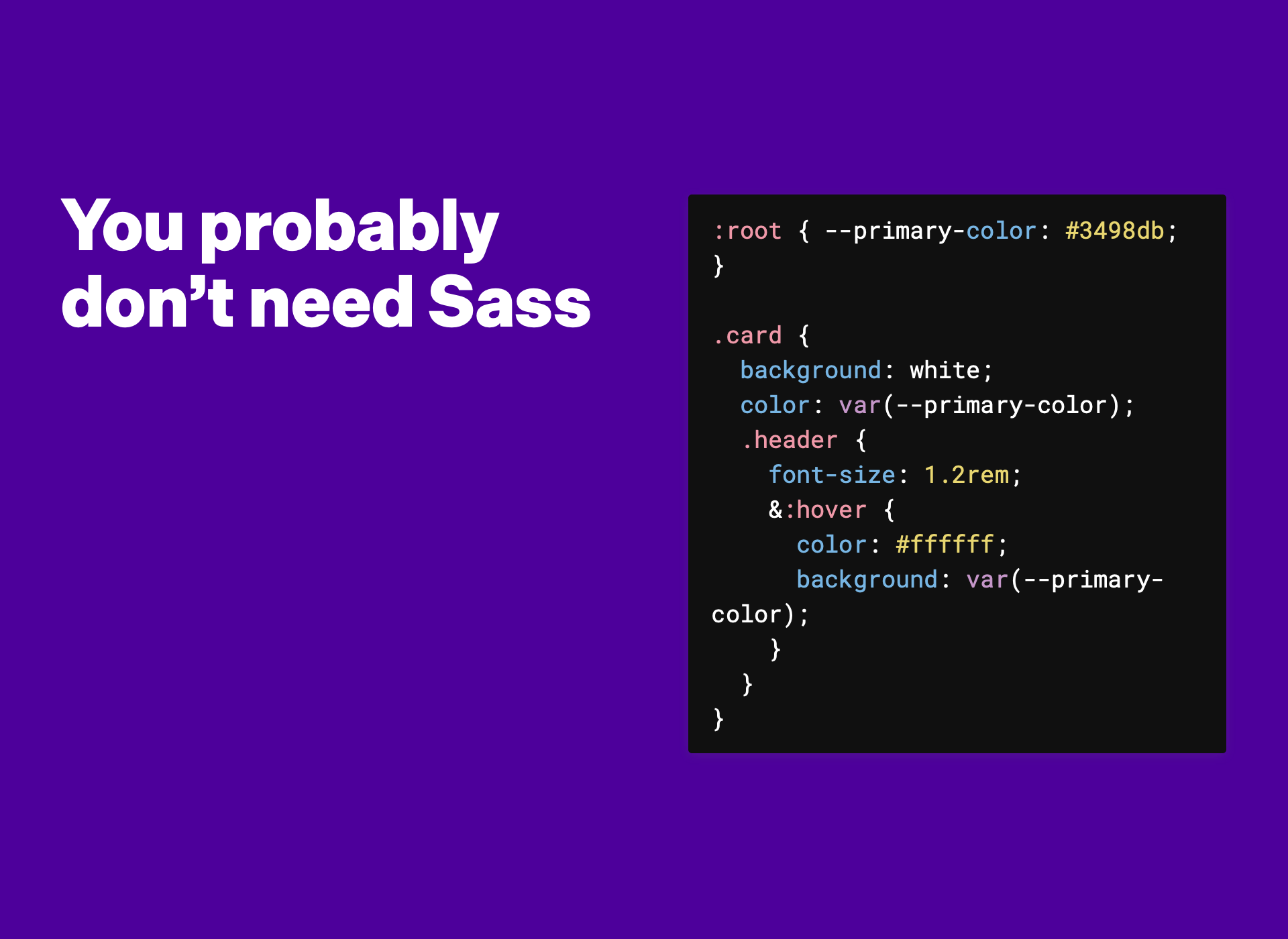 function. These are actually way better than Sass variables because they can be changed at runtime. And not only by CSS code, but also by JavaScript! This combo gives you endless possibilities to change your design based on user actions.