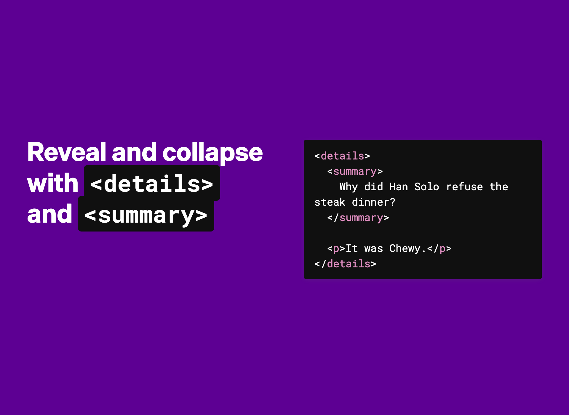 A common need in web pages is to click an element to reveal some content. Previously, this required a bit of fancy CSS or, commonly, a bit of JavaScript. HTML can do this very easily with the built-in <details>