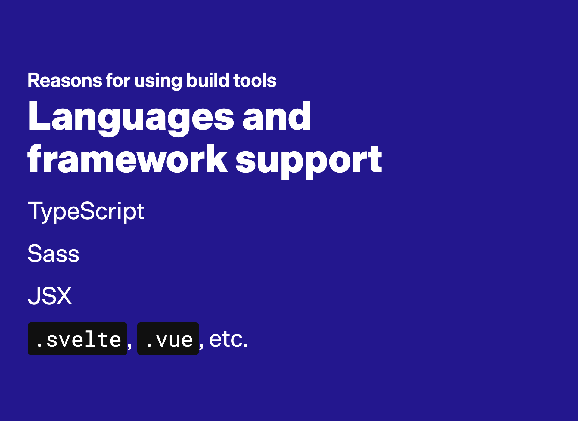 A huge reason for turning to build tools is to support languages and framework file formats that the browser doesn’t recognize. The biggest examples are: